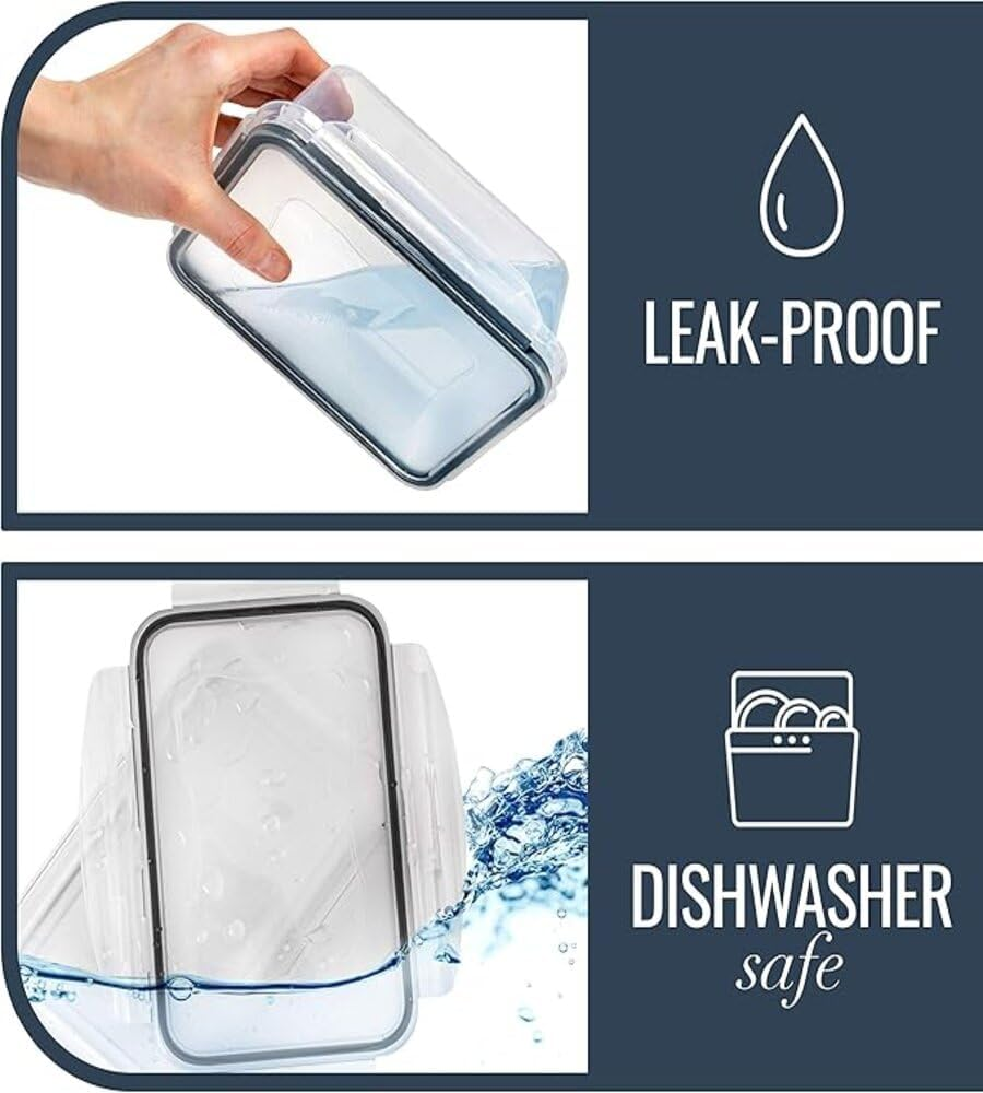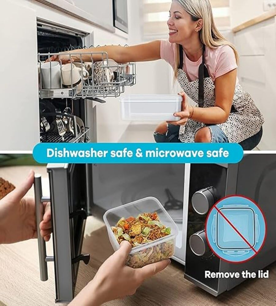 Made from durable, food-safe plastic, these containers are microwave-safe (base only), freezer-friendly, and dishwasher-safe (top rack recommended). Their stackable, nestable design saves space in your fridge, pantry, or kitchen drawers.
