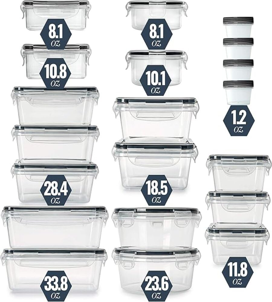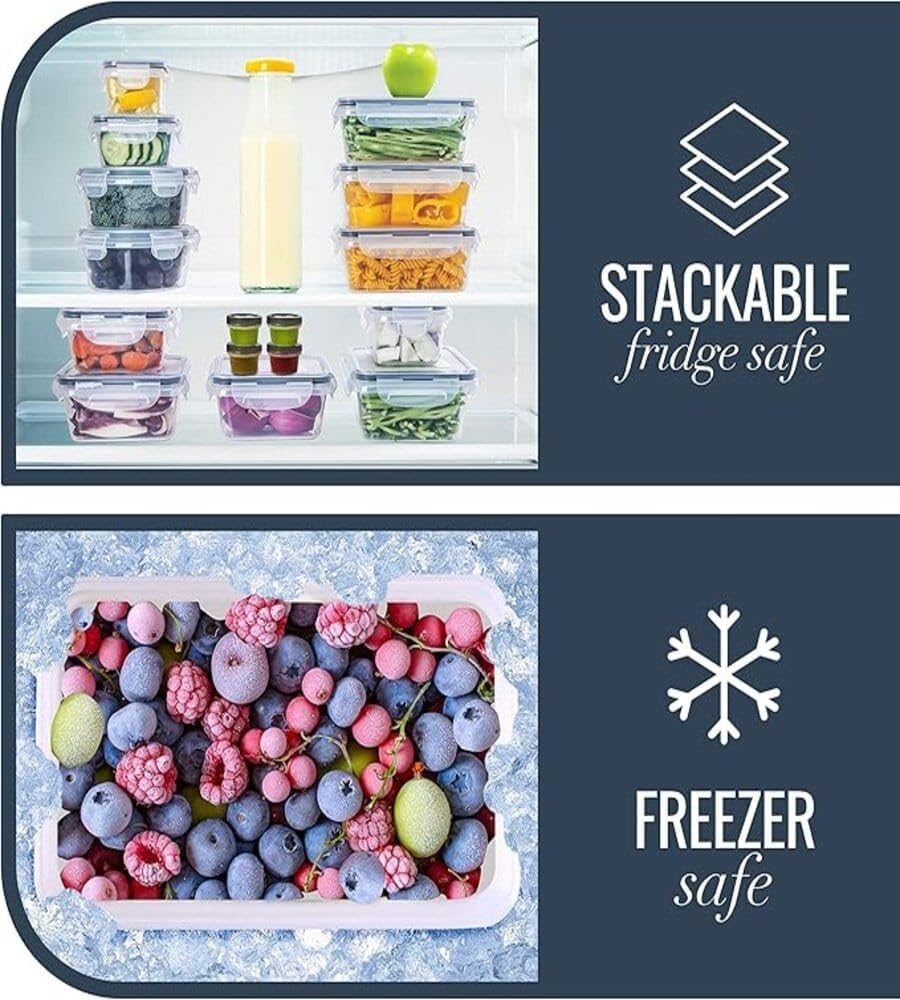 Designed with 4-hinge locking lids, each container forms a leak-proof, airtight seal to prevent spills and preserve freshness. The set includes a variety of sizes—from 35ml mini cups for sauces and spices to 1000ml containers for full meals—making it ideal for everything from lunchboxes to freezer storage.